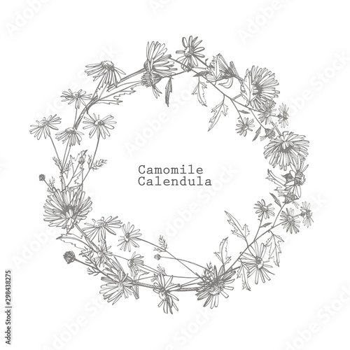 Chamomile. Collection of hand drawn flowers and plants. Botany. Set. Vintage flowers. Black and white illustration in the style of engravings.