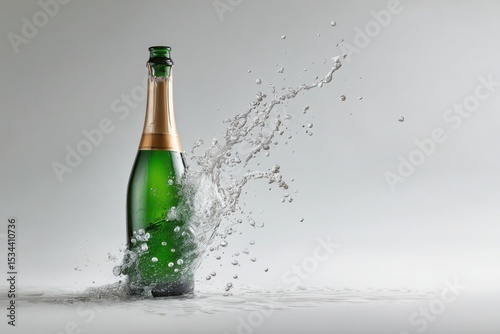 Champagne bottle pops, releasing bubbles and water splashes in an elegant display of celebration in a minimalistic setting