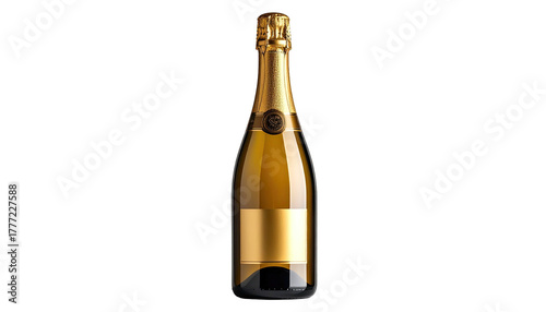 Champagne bottle with golden foil, black background, centered