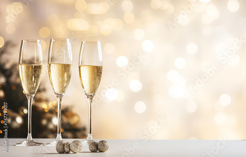 champagne flutes on white holiday table decor with bokeh backgro