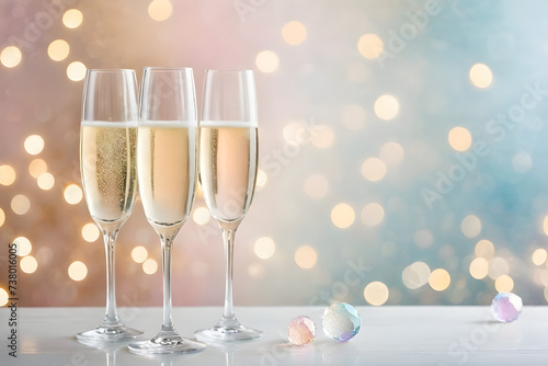 Champagne glasses, translucent crystal reflecting a gentle bokeh effect from a minimalist background with soft pastel hues. Generative AI