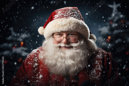 Charismatic smiling santa claus on a snowy evening before Christmas