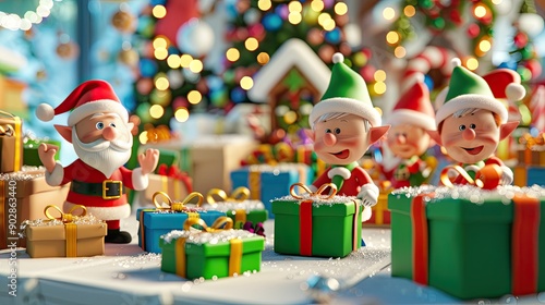 Charming animated scene of Santa and his elves working in a festive Christmas workshop, surrounded by presents, decorations, and holiday cheer...