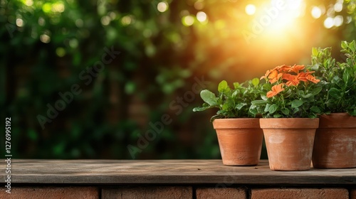 Charming arrangement of terracotta pots filled with green plants under radiant sunlight, symbolizing renewal, growth, and the harmonious connection to nature.