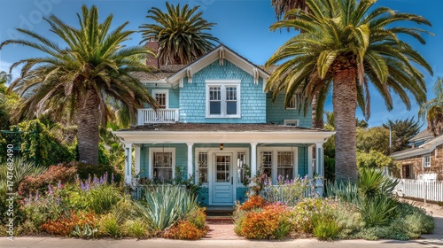 Charming Coastal Home Surrounded by Lush Tropical Plants and Palm Trees, Featuring Blue Shingles, Vibrant Flowers, and a Welcoming Porch on a Sunny Day
