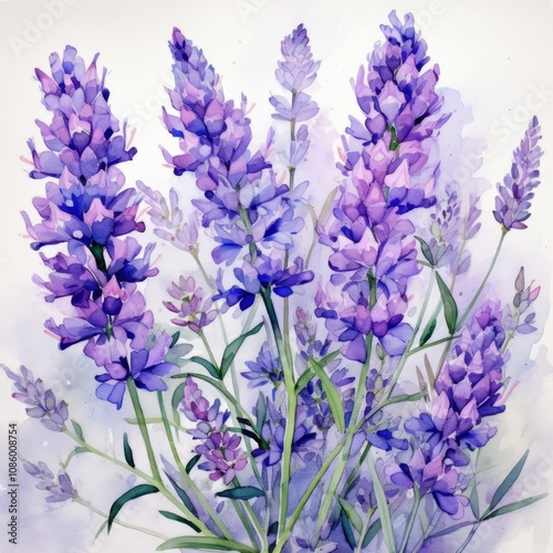 Charming depiction of lavender blooms with soft watercolor strokes, highlighting rich purples and lush greenery. Ideal for floral designs, creative projects, and tranquil home decor.