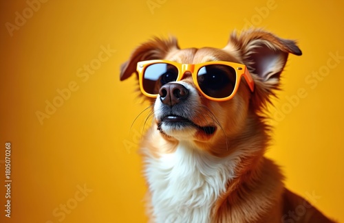 Charming dog wears orange sunglasses against vibrant yellow backdrop. The fluffy pet displays a playful and stylish attitude. This image evokes happiness and fun perfect for lifestyle content.