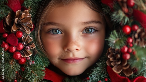 Charming Girl Framed by Festive Christmas Wreath