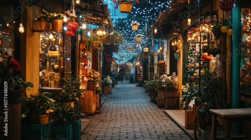 Charming Night Market Alley with Fairy Lights and Vibrant Flowers