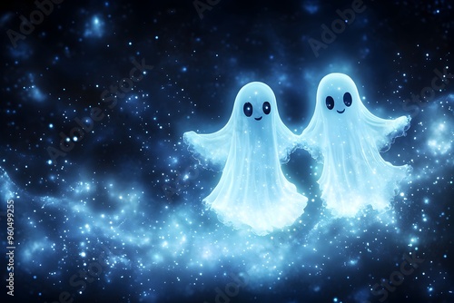 Charming Specters, Two playful ghosts intertwined in a whimsical dance, drifting through a moonlit night, exuding warmth and friendship.