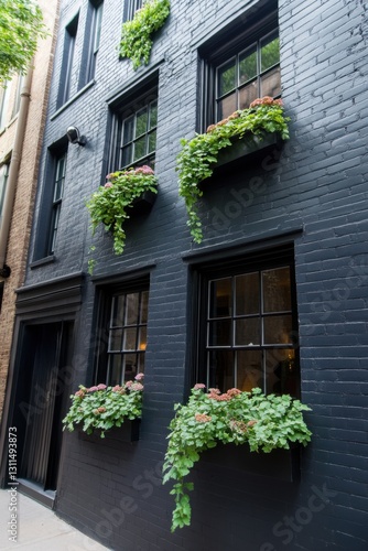 Charming urban building adorned with vibrant window boxes filled with lush greenery and colorful flowers in a cozy alleyway