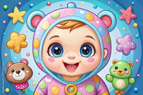 Charming vector illustration of an adorable baby character in a cute onesie, perfect for children's products and decor. A delightful addition to any