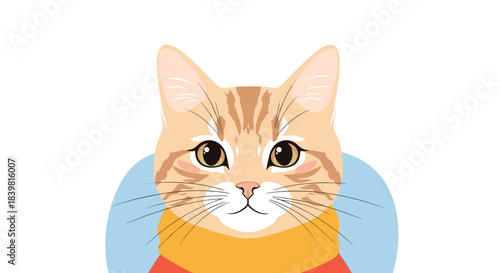 Charming vector illustration of an orange tabby cat with large, warm eyes, wearing a yellow scarf and red shirt, looking at the viewer.