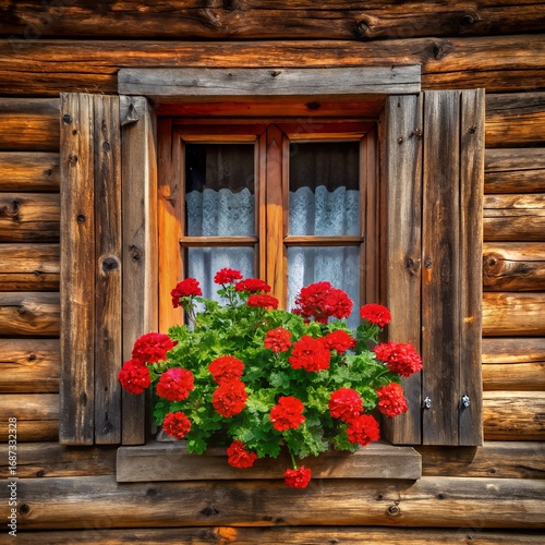 Charming window box with vibrant red geraniums on a rustic wooden chalet, evoking a sense of alpine beauty