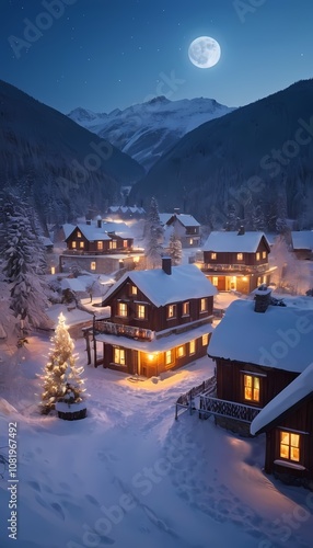 Charming winter cabins illuminated by moonlight in a serene mountain landscape at night, Christmas