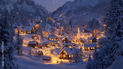 Charming winter village illuminated at night, nestled in snow-covered mountains, creating a cozy holiday atmosphere.