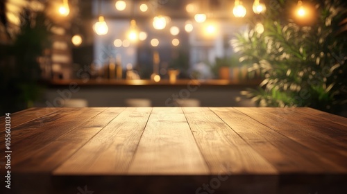 Charming wooden dining table illuminated by soft ambient light in a cafe featuring bokeh effects ideal for product display and business presentation templates