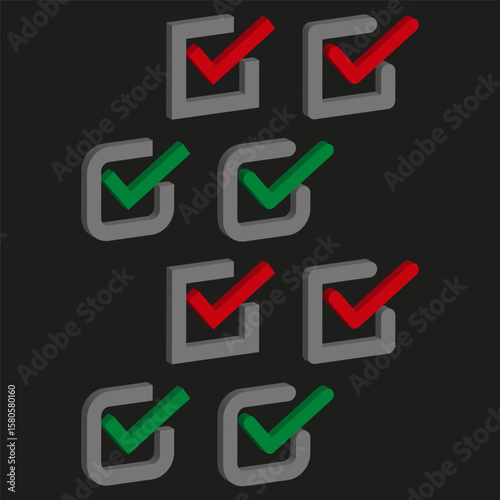 Checkbox selection symbols. Isometric checkmarks. Red green choices. Vector interface elements.