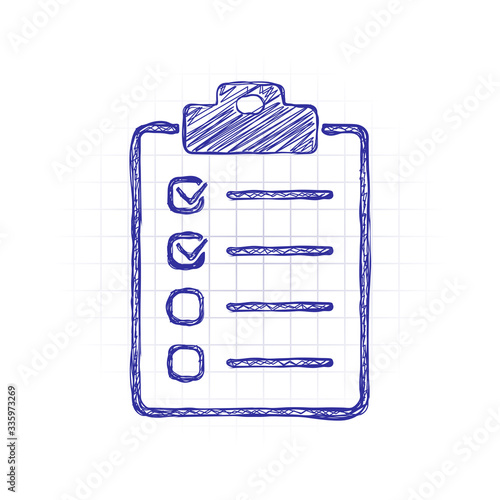 Checklist icon. Hand drawn sketched picture with scribble fill. Blue ink. Doodle on white background