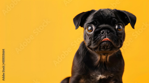 Cheerful black pug on yellow background with space for text Captivating pet in focus