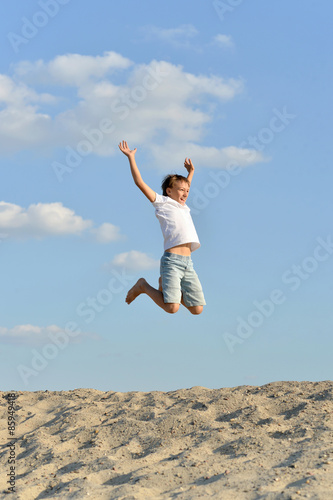 Cheerful boy jumping on sand