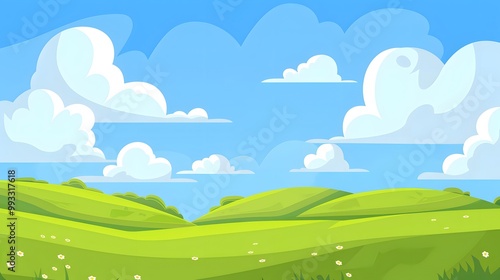 Cheerful Cartoon Landscape Featuring Bright Blue Sky, Fluffy White Clouds, and Soft Rolling Hills of Green Grass