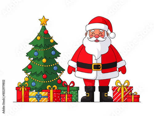 Cheerful cartoon Santa Claus stands next to a decorated Christmas tree with colorful presents underneath, against a white background.