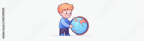cheerful child holding globe, representing exploration and learning about world. This illustration captures joy of discovery and curiosity in minimalist style