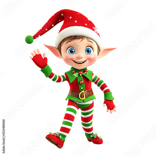 Cheerful Christmas elf waving, red and green striped outfit, transparent background, festive holiday character illustration