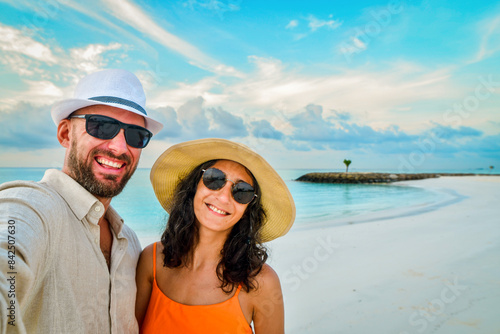 Cheerful couple on vacation in Maldives taking selfie on sandy tropical beach- Millennial guy and girl enjoying summertime day out smile at camera together