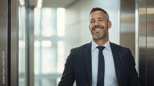 cheerful depiction of a businessman in a contemporary elevator, showcasing a happy and successful professional demeanor. Perfect for images highlighting modern office settings, car