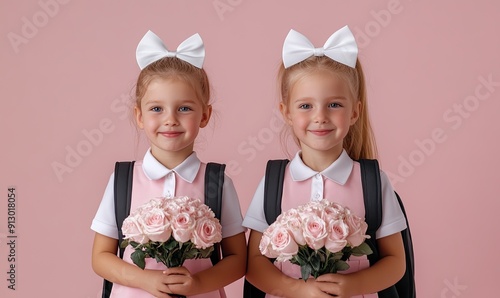 Cheerful First Graders with Roses and Backpacks in Front of School