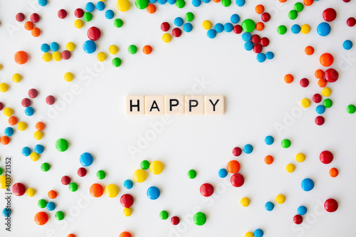 cheerful flat lay white backdrop scene surrounded by rainbow candies