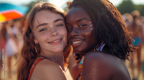 Cheerful friends lesbian girls at the music festival