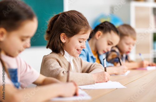 Cheerful girl solving test with classmates