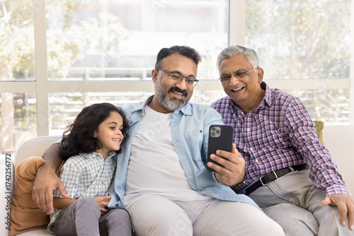 Cheerful granddad, great grandpa and grandkid girl having fun