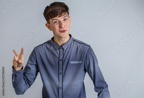 Cheerful guy in a shirt posing on a light blue background