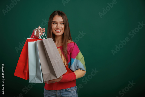Cheerful, holding shopping bags. Young woman is standing against green background in the studio