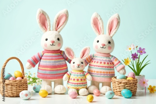 Cheerful knitted bunnies in pastel Easter sweaters surrounded by colorful painted eggs and spring flowers, joyful celebration of Easter. Cartoon illustration for children's books