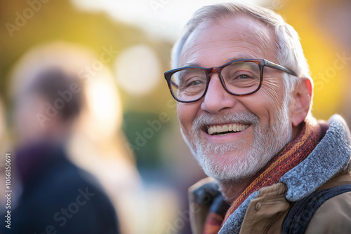 Cheerful Mature Caucasian Man with Glasses Smiling Outdoors on a Sunny Autumn Day.