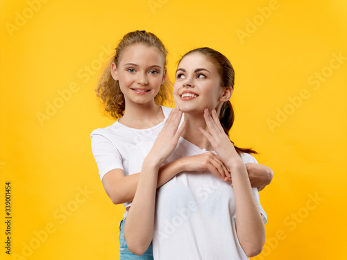 Cheerful Mom and daughter in white T-shirts hugs joy smile