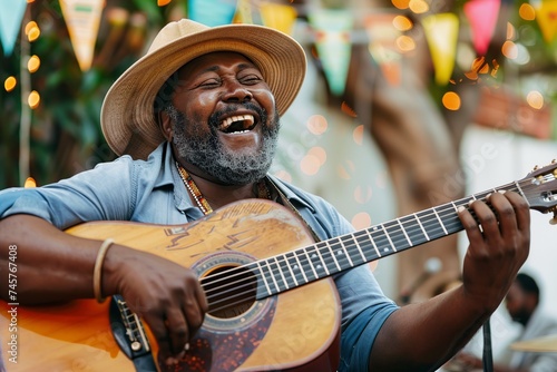 cheerful musician playing the guitar brings joy
