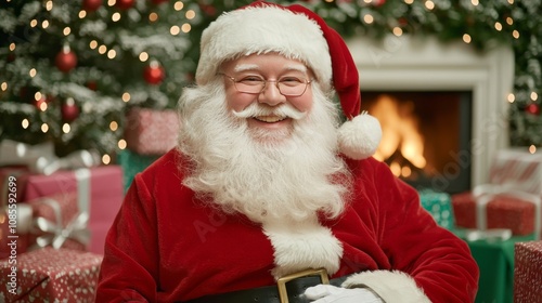 Cheerful Santa Claus Portrait in a Festive Living Room Surrounded by Christmas Gifts and Holiday Decor