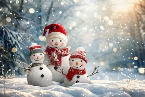 Cheerful Snowman Family with Santa Hats and Red Scarves Enjoying a Snowy Winter Wonderland in a Festive Holiday Scene
