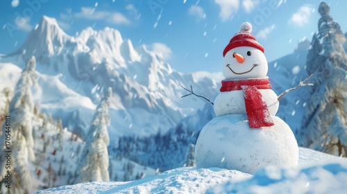 Cheerful snowman in a winter wonderland with snow-capped mountains backdrop