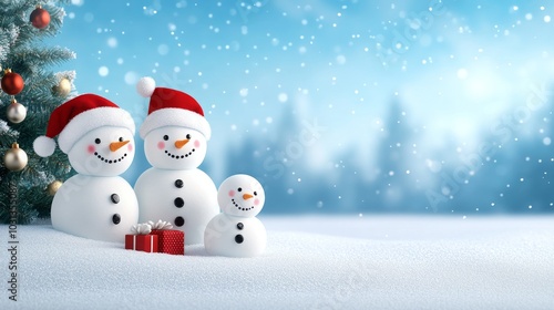 Cheerful snowmen celebrating Christmas with gifts