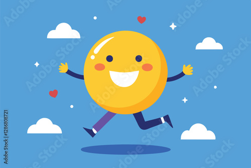 Cheerful yellow cartoon sun character, jumping happily, blue sky background, white fluffy clouds, tiny red heart, sparkling stars, flat design illustration, vibrant colors, playful mood, vector art