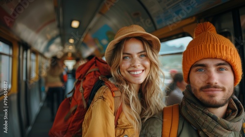 Cheerful young couple wearing stylish hats and travel gear smiles warmly inside a train, capturing the essence of modern travel and adventure.