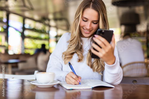 Cheerful young woman talk phone conversation on smartphone doing order and making notes of information about delivery. Positive hipster girl calling on mobile phone sitting with coffee