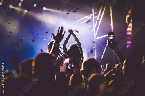 cheering crowd with raised hands and falling confetti at concert - music festival